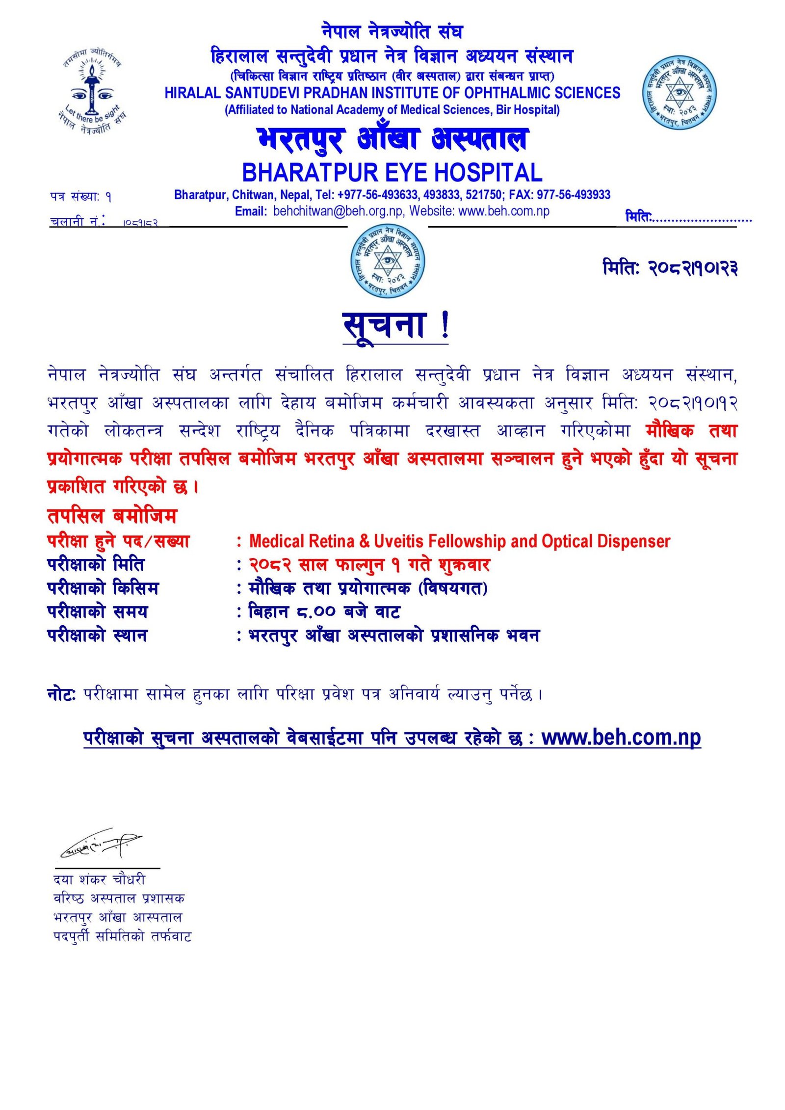 Bharatpur Eye Hospital; BEH (Hiralal Santudevi Pradhan Institute of Ophthalmic Sciences) is located in the Chitwan District of southern central Nepal. BEH is a nonprofit making, charitable organization under the umbrella of Nepal Netra Jyoti Sangh (NNJS). Its objective is to provide high-quality comprehensive eye care services at an affordable cost to local as well as patients from neighboring districts like Gorkha, Lamjung, Nawalpur, Tanahau, Makwanpur, Parsa & Dhading which comprises of about two million populations. In addition to Base Hospital located at Bharatpur Metro Municipality, BEH has established 3 secondary level eye hospitals and 1 city clinic and 18 eye care centers at different places in its catchment area.